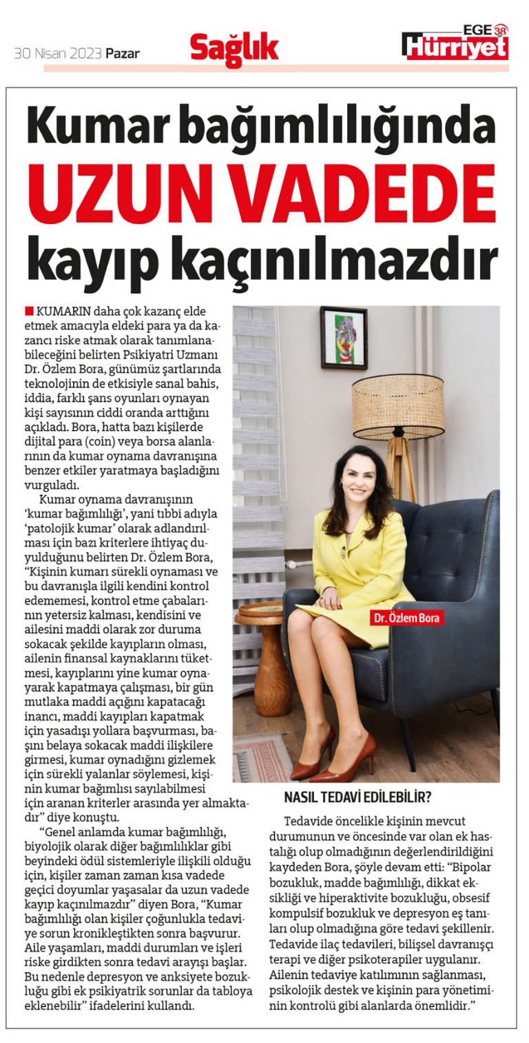 "Genel anlamda kumar bağımlılığı, biyolojik olarak diğer bağımlılıklar gibi beyindeki ödül sistemleriyle ilişkili olduğu için, kişiler zaman zaman kısa vadede geçici doyumlar yaşasalar da uzun vadede kayıp kaçınılmazdır" diyen Bora, "Kumar bağımlılığı olan kişiler çoğunlukla tedaviye sorun kronikleştikten sonra başvurur. Aile yaşamları, maddi durumları ve işleri riske girdikten sonra tedavi arayışı başlar. Bu nedenle depresyon ve anksiyete bozukluğu gibi ek psikiyatrik sorunlar da tabloya eklenebilir" ifadelerini kullandı.